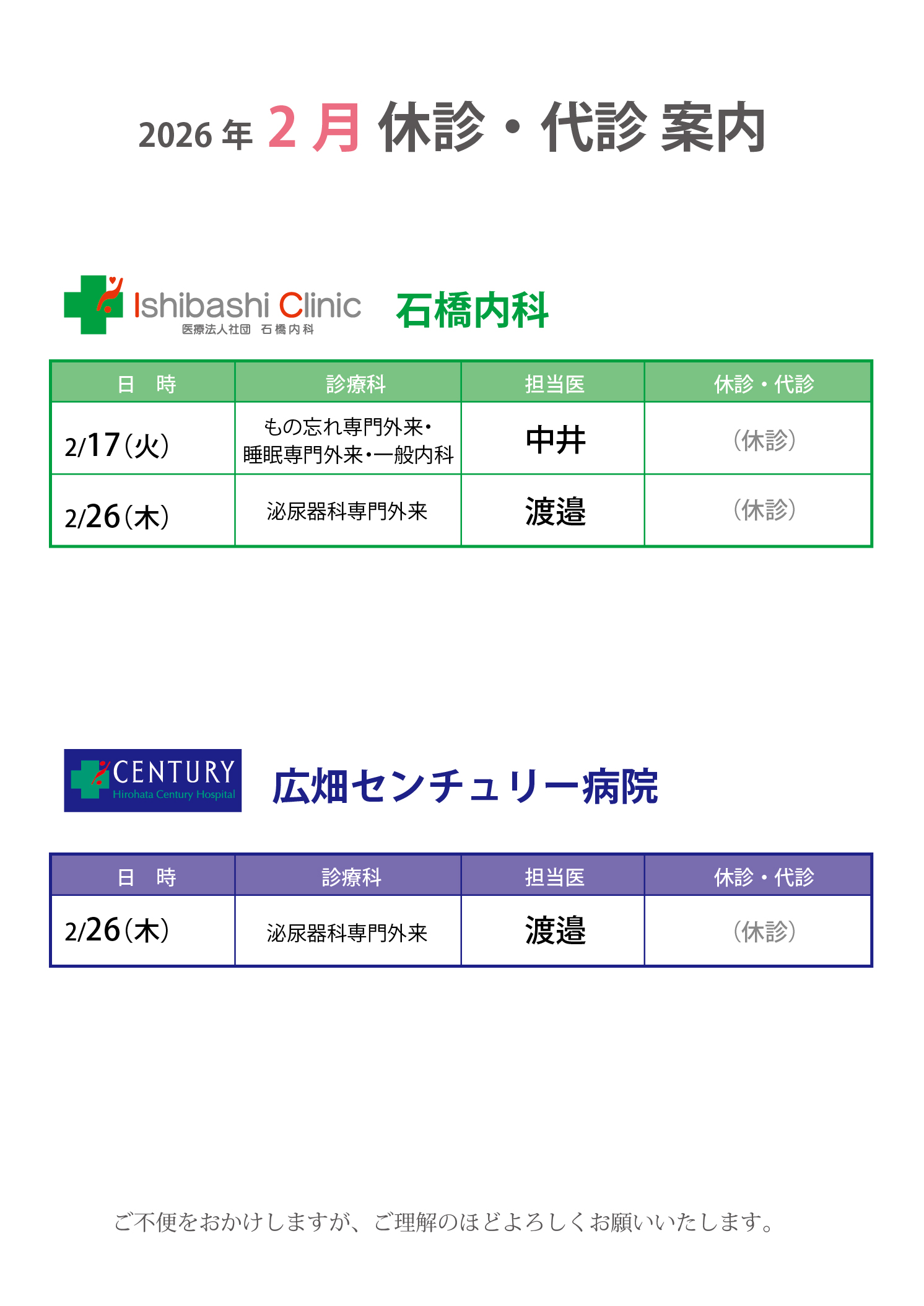 2月 休診のご案内